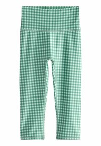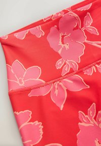 Svetlo koralové legíny s vysokým pásom a krátkou dĺžkou s veľkým ružovým kvetinovým vzorom a plochým šitim vhodné na športové oblečenie.