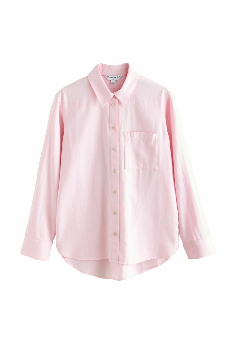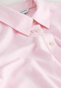 Svetloružová dlhá košeľa s gombíkmi má golier, predné vrecko a zaoblený spodok. Vyrobená z mäkkého materiálu s guľôčkovými gombíkmi pripomínajúcimi perly.