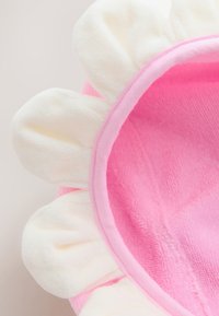 Ružové detské pončo s kapucňou s kvetinovým vzorom, plyšové detaily v tvare margarét na kapucni a vreckách, s úsmevnými tvárami na kvetoch.