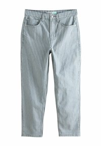 Svetlomodré rifle z denimu so strihom na rovno, piatimi vreckami a jemným vyblednutím. Sú vybavené zapínaním na gombík a pútkami na opasok.