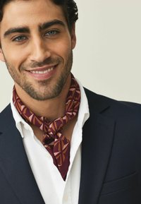 • Bordový kravata s textúrovanou tkaninou a špicatým koncom, doplnená béžovým vreckovým štvorcom s čiernym kvetinovým vzorom.
