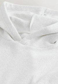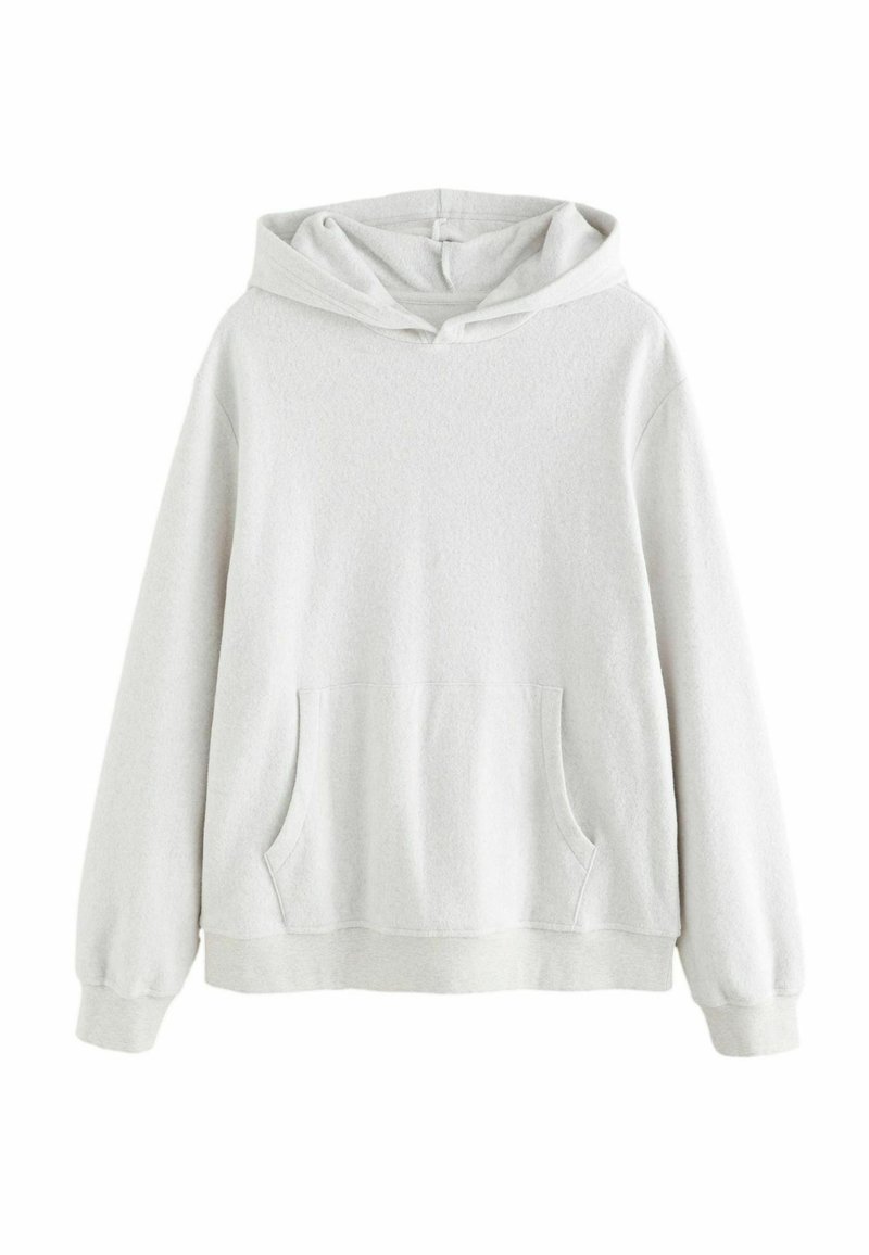 Svetlosivé mikina s kapucňou z mäkkej fleece tkaniny, vybavená klokankovým vreckom, rebrovanými manžetami a voľným strihom.