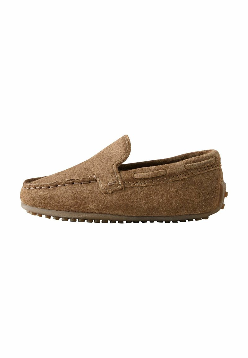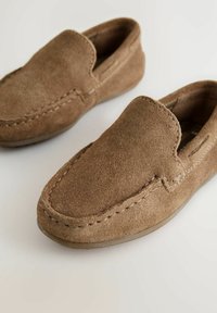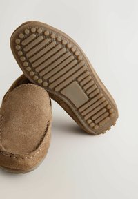 Hnedý semišový mokasínový papuč s nízkym profilom, zaoblenou špičkou a prešívanými detailmi na vrchu. Flexibilná gumová podrážka s malými vzorkami.