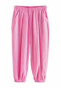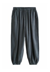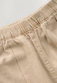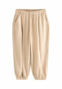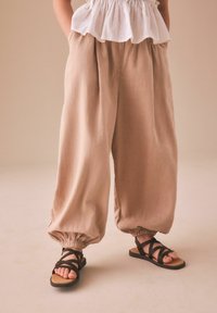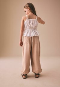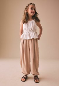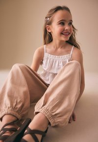 Mladé dievča oblečené v bielom tielku bez rukávov, voľných béžových nohaviciach a čiernych sandáloch, stojace pred neutrálne béžovým pozadím.
