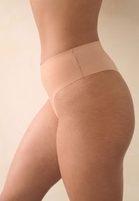 Žena nosi bezšvové, vysoko strihané spodné prádlo farby nahého tela a zodpovedajúcu podprsenku, ktorá odhaľuje stred tela a hornú časť stehien na jednoliatom pozadí.