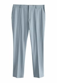 Modré priliehavé nohavice s hladkou textúrou, slim fit strihom a pútkami na opasok, spárované s čiernymi formálnymi topánkami. Prítomné klasické detaily štýlu.