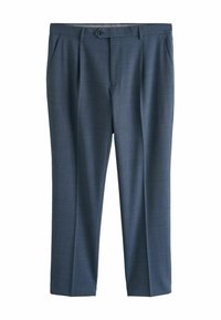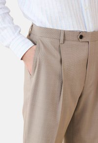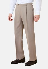Muž oblečený v béžových skladaných spoločenských nohaviciach, bielej pruhovanej košeli s dlhým rukávom a tmavo hnedej koženej mokasíne, stojaci na bielom pozadí.