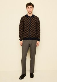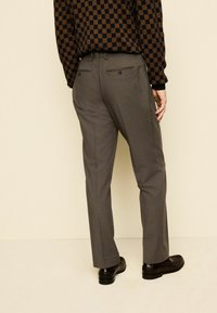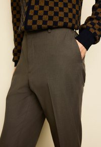 Sivé nohavice na mieru s hladkou textúrou, rovný strih a jemné záhyby, doplnené o čierno-hnedý kockovaný sveter.