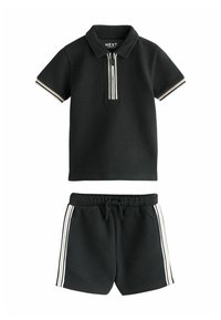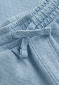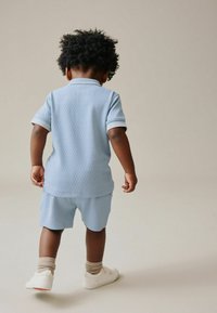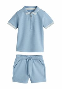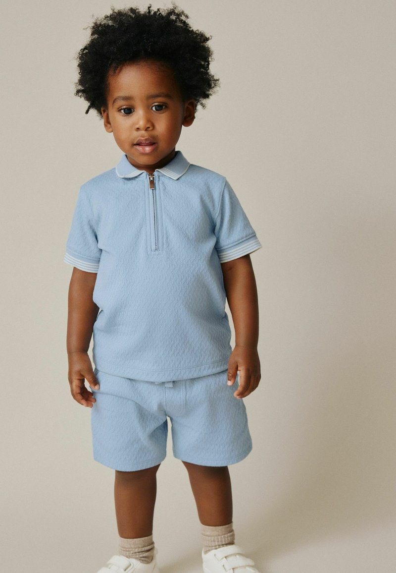 Svetlomodré textúrované polokošeľa so zipsom a bielymi akcentmi, kombinovaná so zodpovedajúcimi šortkami. Topánky sú biele s Velcro páskami.