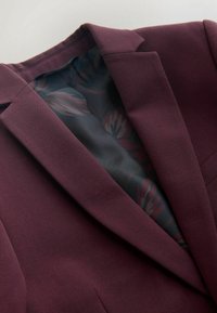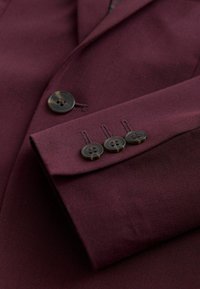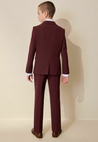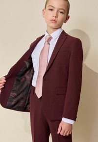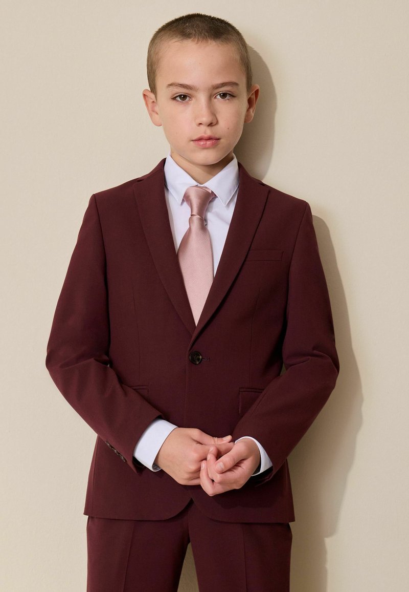 Chlapec s krátkymi vlasmi v bordovom obleku, bielej košeli a svetloružovej kravatě, stojaci so založenými rukami na béžovom pozadí.