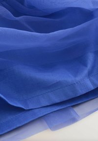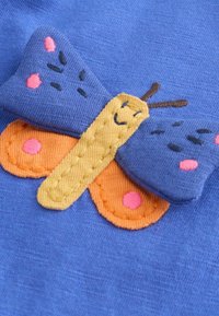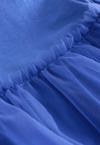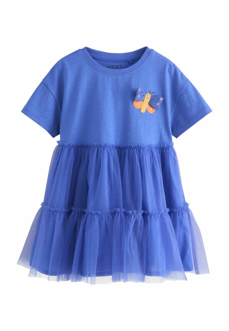 Modré šaty s krátkym rukávom, s vrstvami tylovej sukne a malou farebnou motýľovou aplikáciou na hrudi.