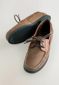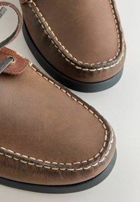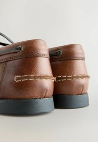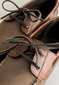 Pánska hnedá kožená lodná topánka s ozdobnými šnúrkami na vrchu a okolo päty, čierna plochá podrážka, bočný profil na bielom pozadí.