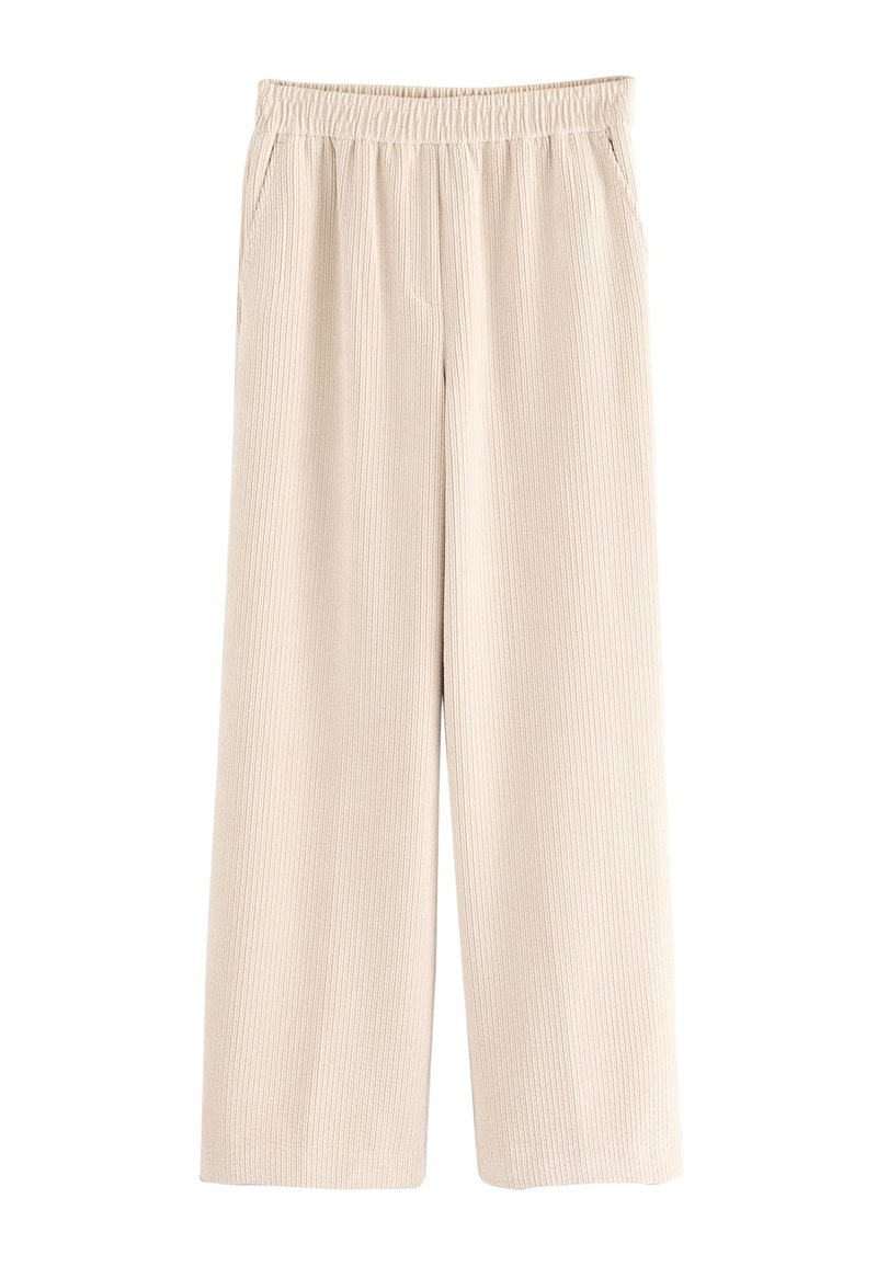 Béžové široké nohavice s elastickým pásom, ktoré majú rebrovanú textúru a dve bočné vrecká. Hladká tkanina so svetlým strihom.