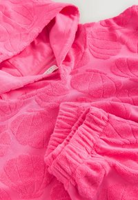 Ružová mikina s kapucňou a zodpovedajúce šortky, s textúrovaným vzorom listov, vyrobené z mäkkého materiálu a s uvoľneným strihom.