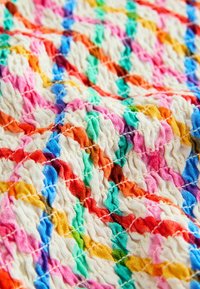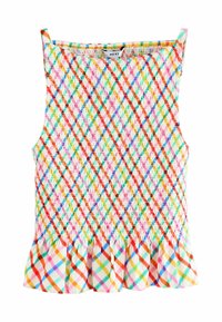 Farebný tielkový top z tkaniny s károvaným vzorom v ružovej, zelenej, modrej a oranžovej farbe s volánovým lemom.
