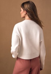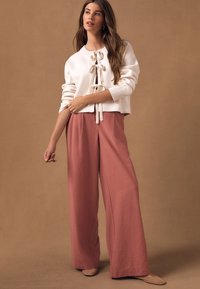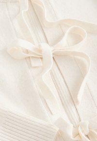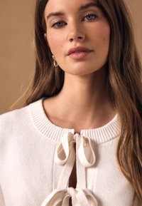 Mladá žena s dlhými hnedými vlasmi, ktorá nosí zlaté kruhové náušnice a krémový pletený sveter previazaný dvoma mašľami na výstrihu.
