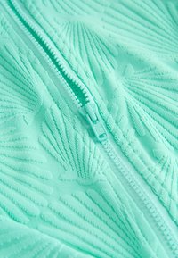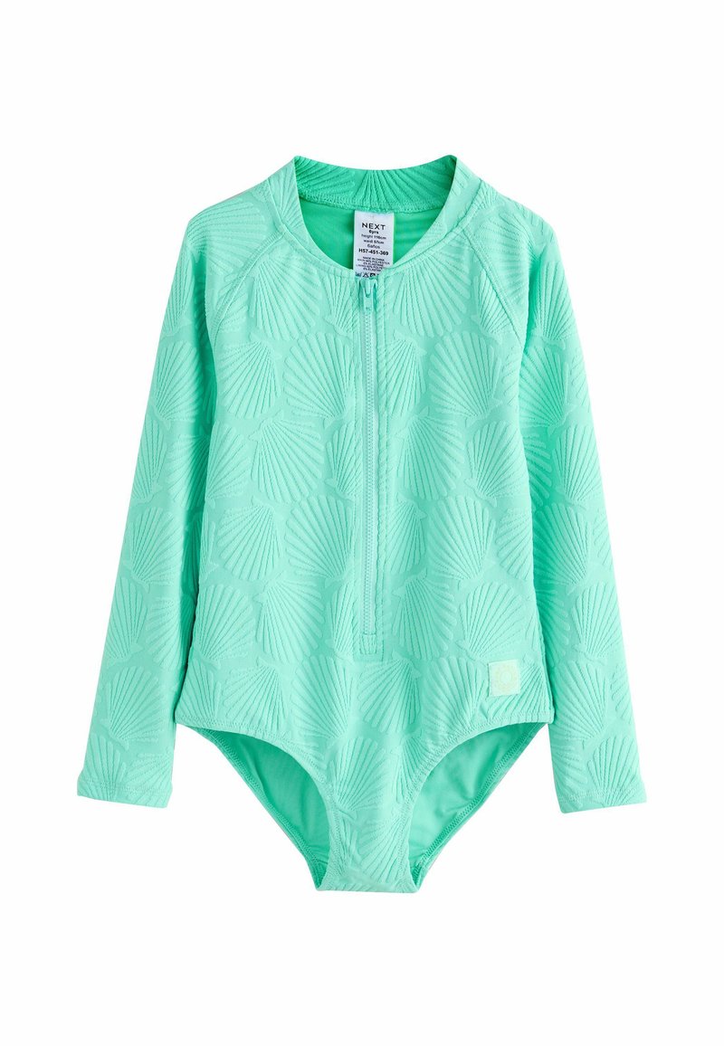 Dlhý rukáv plaviek v mäte zelenej farbe s textúrou vzoru mušlí, vybavený predným zipsom a zaobleným golierom pre jednoduché nosenie.