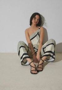 Noha v čiernej plochej sandále s tenkými remienkami a prackou na členku, v páre s čierno-bielymi pruhovanými širokými nohavicami.