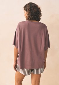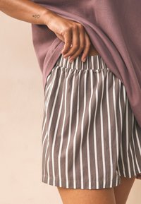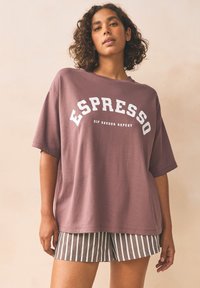Ružové tričko s krátkym rukávom s bielym nápisom "ESPRESSO". Kombinované s hnedo-bielymi pruhovanými šortkami s elastickým pásom.