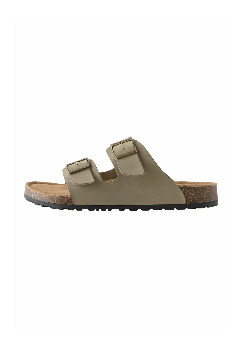 Olivovo zelené sandále s otvorenou špičkou, dvomi nastaviteľnými prackami, korkovou stielkou a čiernou textúrovanou podrážkou, zobrazené v bočnom profile.