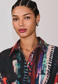 Mladá žena so zapletenými vlasmi nosí strieborné kruhové náušnice a farebnú abstraktnú vzorovanú košeľu, sebeisto sa pozerá do kamery.