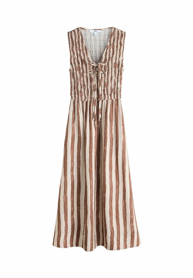 Midi šaty bez rukávov s hnedými a béžovými vertikálnymi pruhmi, nariaseným živôtikom, hlbokým výstrihom do tvaru V a detailom so zaväzovaním vpredu.