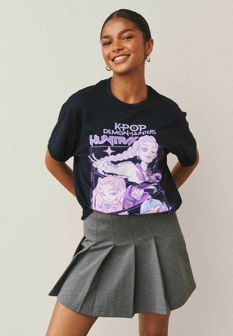 Mladá žena sa usmieva, nosí čierne tričko s grafickým motívom s animovanými postavičkami a textom "KPOP Demon Hunters Huntrix" a sivú plisovanú sukňu.