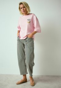 Nadrozmerné ružové bavlnené tričko s výšivkou "SWEET LIKE" a pruhované béžové a námornícke nohavice s vreckami, doplnené hnedými balerínami.