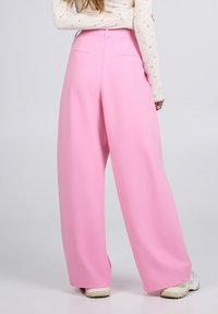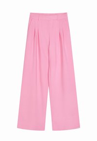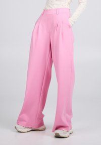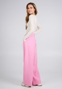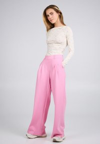 Ružové nohavice s širokými nohavicami a prednými záhybmi, nosené s bielymi teniskami a svetlým dlhým rukávom, ruky v vreckách na jednoduchom pozadí.