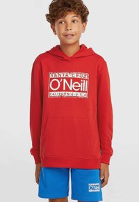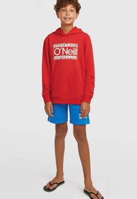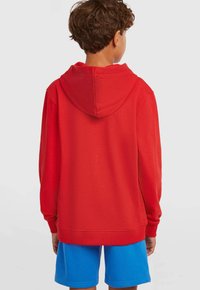 Červená mikina s kapucňou, predným vreckom a bielym logom. Kombinovaná s modrými kraťasmi s malou nášivkou loga. Nosená s čiernymi žabkami.