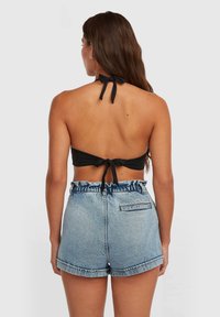 Čierny halter crop top s výstrihom do V a tvarovanými košíkmi, v kombinácii so svetlomodrými denim krátkymi nohavicami s nariaseným pásom a zrolovanými lemy.