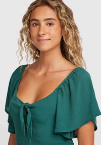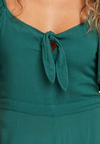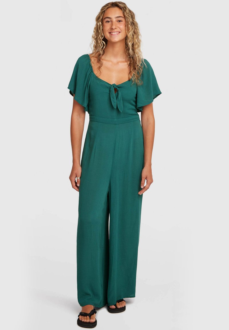 Tyrkysový overal s krátkymi volánovými rukávmi, zaväzovaním vpredu a širokými nohavicami. Vyrobený z ľahkej látky s hladkým povrchom.