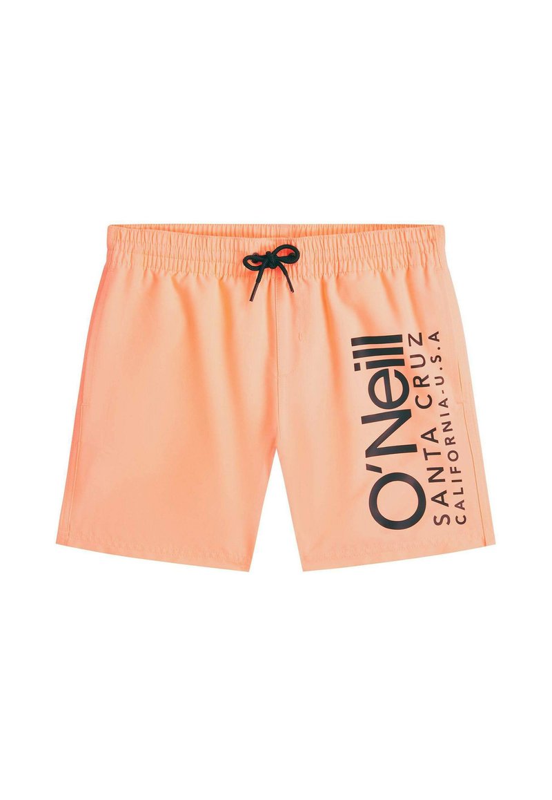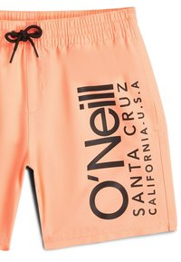 Svetlo oranžové plavkové šortky s čiernym šnúrkou a čiernym textom "O'Neill Santa Cruz California U.S.A" na pravom nohavici.