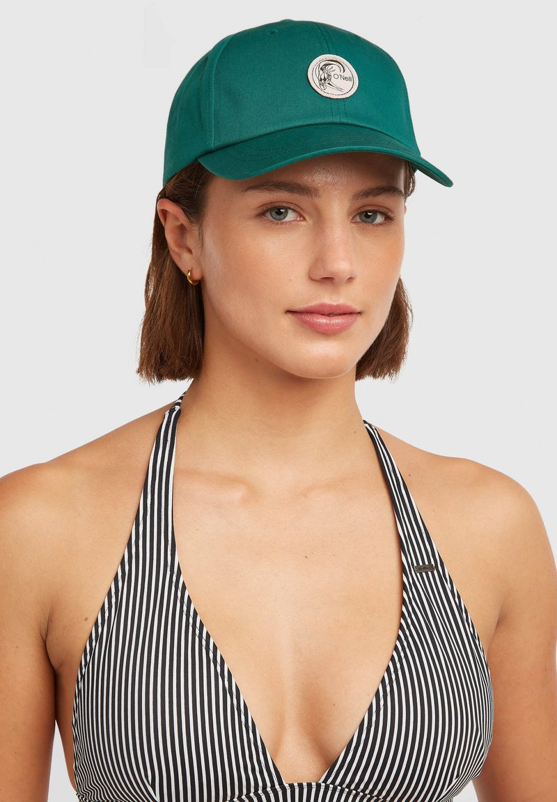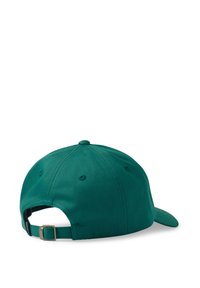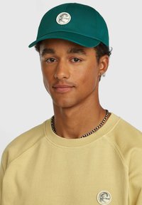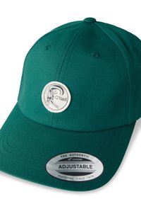 Zelená čiapka s oblým šiltom a kruhovým logom vpredu. Textília je hladká so štruktúrovaným strihom.