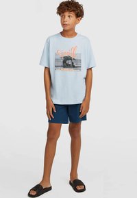 Svetlomodré bavlnené tričko s grafickou potlačou nákladného auta, v kombinácii s námornícky modrými šortkami a čiernymi šľapkami. Jednoduchý dizajn a ležérny strih.