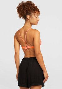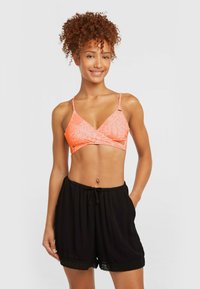 Korálovo ružový bralet s kvetinovým vzorom a nastaviteľnými ramienkami, kombinuje s čiernymi, voľne strihanými šortkami s čipkovaným lemom.