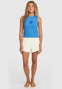 Modrý top bez rukávov s okrúhlym výstrihom a vyšívaným dizajnom; v kombinácii s krémovými šortkami so malým grafickým logom a elastickým pásom.