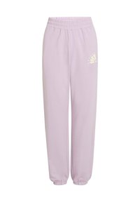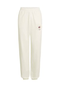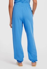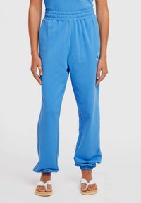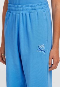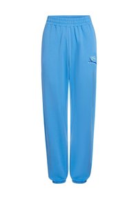 Modré tepláky s elastickým pásom a manžetami. Mäkká, textúrovaná tkanina s malým logom na ľavom stehne. Nosené so sandálmi.