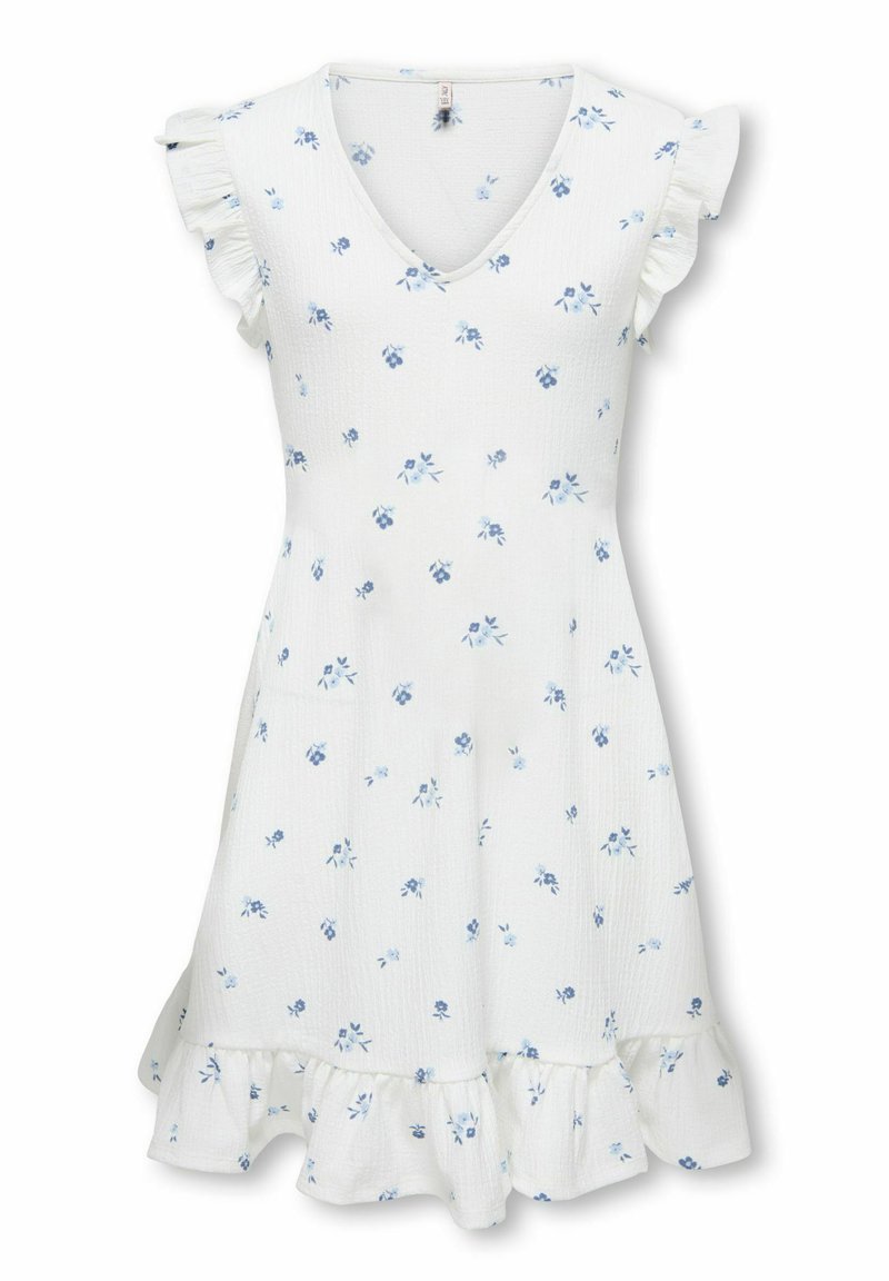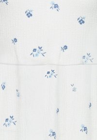 Biele krátke šaty s malým modrým kvetinovým vzorom, volánovými rukávkami, výstrihom do V a volánovým lemom.