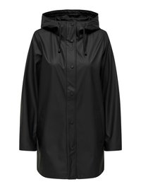 Čierna nepremokavá dažďová bunda s kapucňou, ktorá má predné zapínanie na gombíky a dve bočné vrecká. Hladká, lesklá textúra.