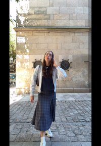 • Šedá mikina cez modré tričko, kostkovaná sukňa, biele tenisky s farebnými akcentmi. Hnedá kabelka cez rameno. Pozadie z kamenných múrov.