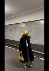 • Žena v žltom čiapke, okuliaroch, bielej blúzke, čiernom dlhom kabáte, širokých šedých nohaviciach, držiaca béžovú kabelku, stojaca na stanici metra Schönleinstraße.