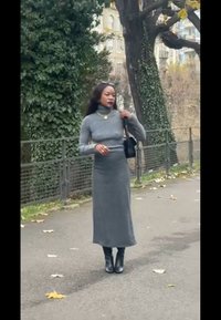 • Sivý rebrovaný rolák, zladená priliehavá dlhá sukňa a čierne členkové čižmy na podpätku po kolená, doplnené slnečnými okuliarmi a zlatým retiazkou.