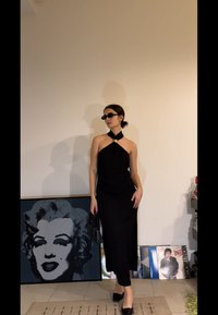 • Žena v čiernych šatách s halterneckom, čiernych slnečných okuliaroch a na vysokých opätkoch drží čiernu kabelku, stojac pri umeleckom diele Marilyn Monroe a vinylových platniach.