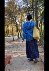 • Modrá zipová mikina vyrobená z mäkkej textílie, nosená cez biele tričko, spárovaná s plisovanou kockovanou sukňou v tmavomodrej a marhuľovej farbe, drží nápoj.