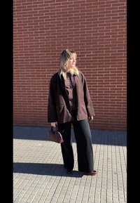 • Hnedá semišová bunda so zapínaním na gombíky, pod ňou károvaná košeľa, čierne široké nohavice a malá bordová kabelka. Textúrované lístie na zemi.
