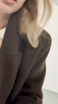 • Hnedý oversize kabát, krémová košeľa, béžové nohavice a lesklé hnedé čižmy po kolená. Čierna kabelka a rukavice dopĺňajú outfit.
