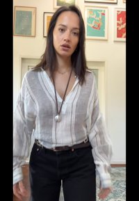 • Ľahká, pruhovaná ľanová blúzka s výstrihom do V, dlhými rukávmi a elastickým spodným okrajom; skombinovaná s čiernymi džínsami a strieborným príveskom na náhrdelníku.