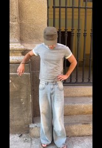 • Sivý skrátený tričko s bielym lemom, skombinované so svetlomodrými širokými nohavicami. Postava má na hlave béžovú čiapku a stojí pred kamennou stenou.
