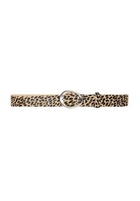 • Top s leopardím vzorom, svetlosivé široké nohavice a kožená čierna kabelka. Obuv má svetlú podrážku s tmavými šnúrami.